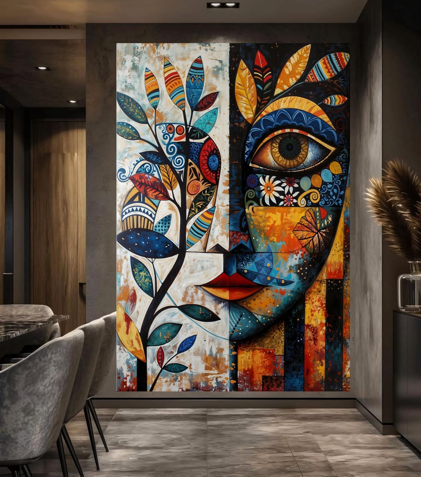 Celebrate the profound bond between culture and the earth with 'Guardian of the Root.' This bold, abstract masterpiece weaves a traditional mask motif into the branches of a life-giving tree, symbolizing the deep roots of our shared human story. Rendered in a vibrant palette of rich primary tones with a vintage, handcrafted texture, this piece feels like a discovered treasure. It is more than decor; it is a tribute to resilience, growth, and the spirits of the natural world