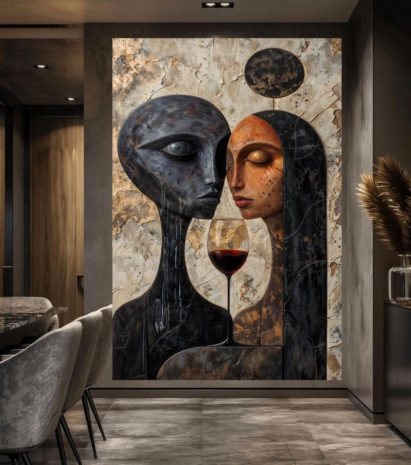 A hauntingly beautiful study of human connection. This cubist-inspired piece explores the layers of a relationship through shadow and light. With glowing orange highlights emerging from a dark, mysterious duo, it captures the 'inner fire' that burns within us all. A sophisticated choice for a modern study or a private gallery space.
