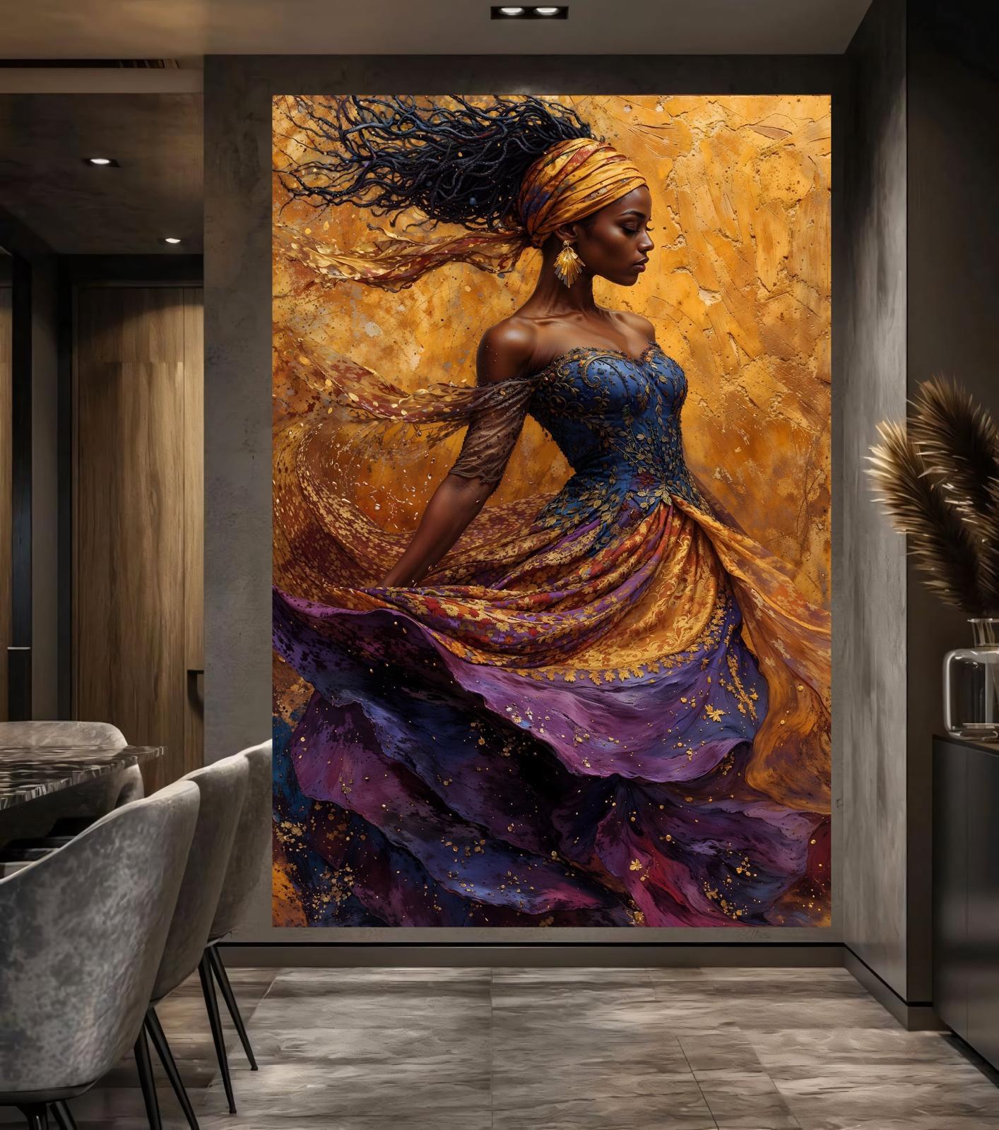 This striking canvas print celebrates the intersection of high fashion and heritage, capturing the majestic energy of an African woman in a moment of graceful movement. The composition honors traditional silhouettes with a modern, abstract twist, making it both a timeless cultural tribute and a contemporary masterpiece.