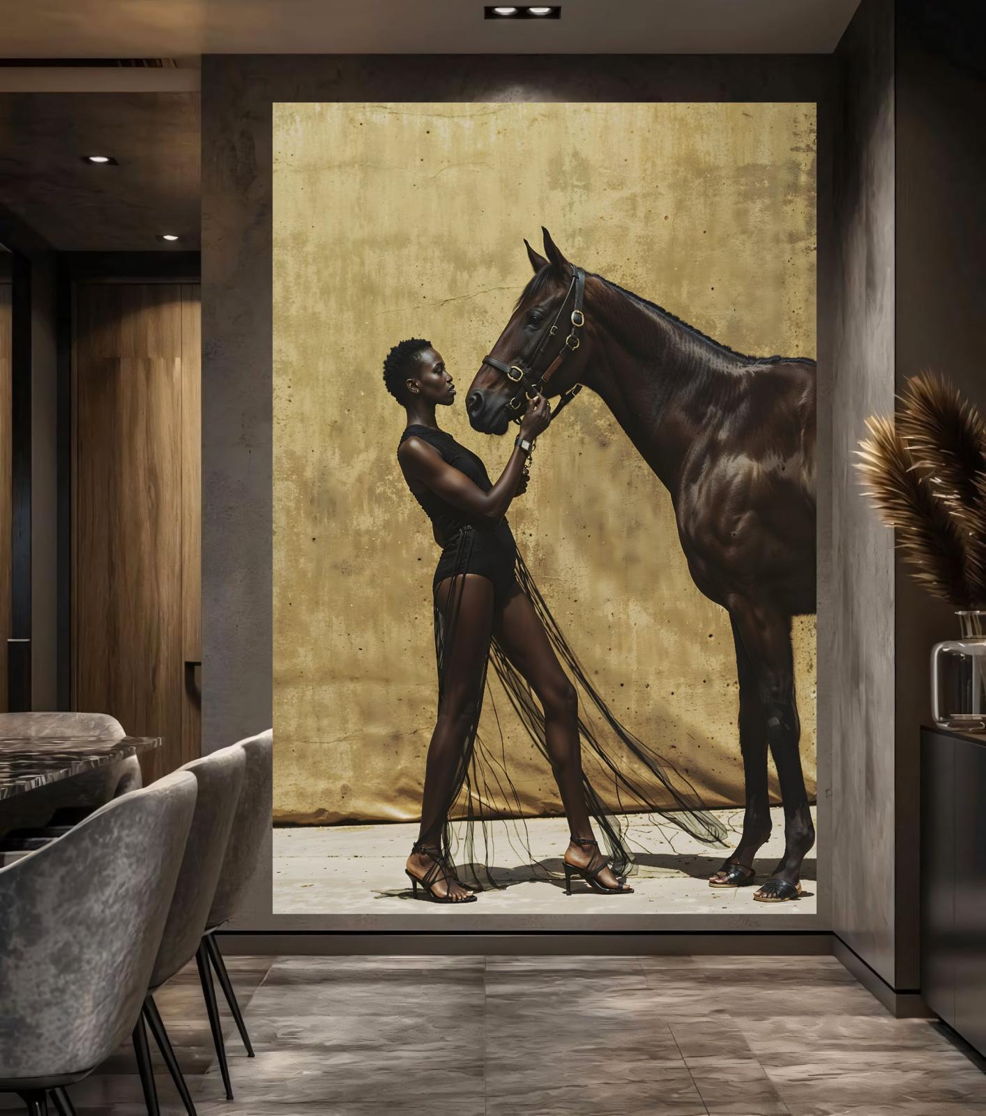 Experience the breathtaking intersection of fashion and the natural world with 'Sovereign Gold.' This high-contrast photographic print captures the raw elegance of a dark bay horse and a woman in a state of perfect, poised connection. Set against a textured, shimmering gold horizon, this piece transforms a moment of companionship into a timeless icon of strength. The flowing fringe and sleek silhouettes create a dramatic interplay of light and shadow, making this the ultimate statement piece for an interior that demands sophistication and soul.