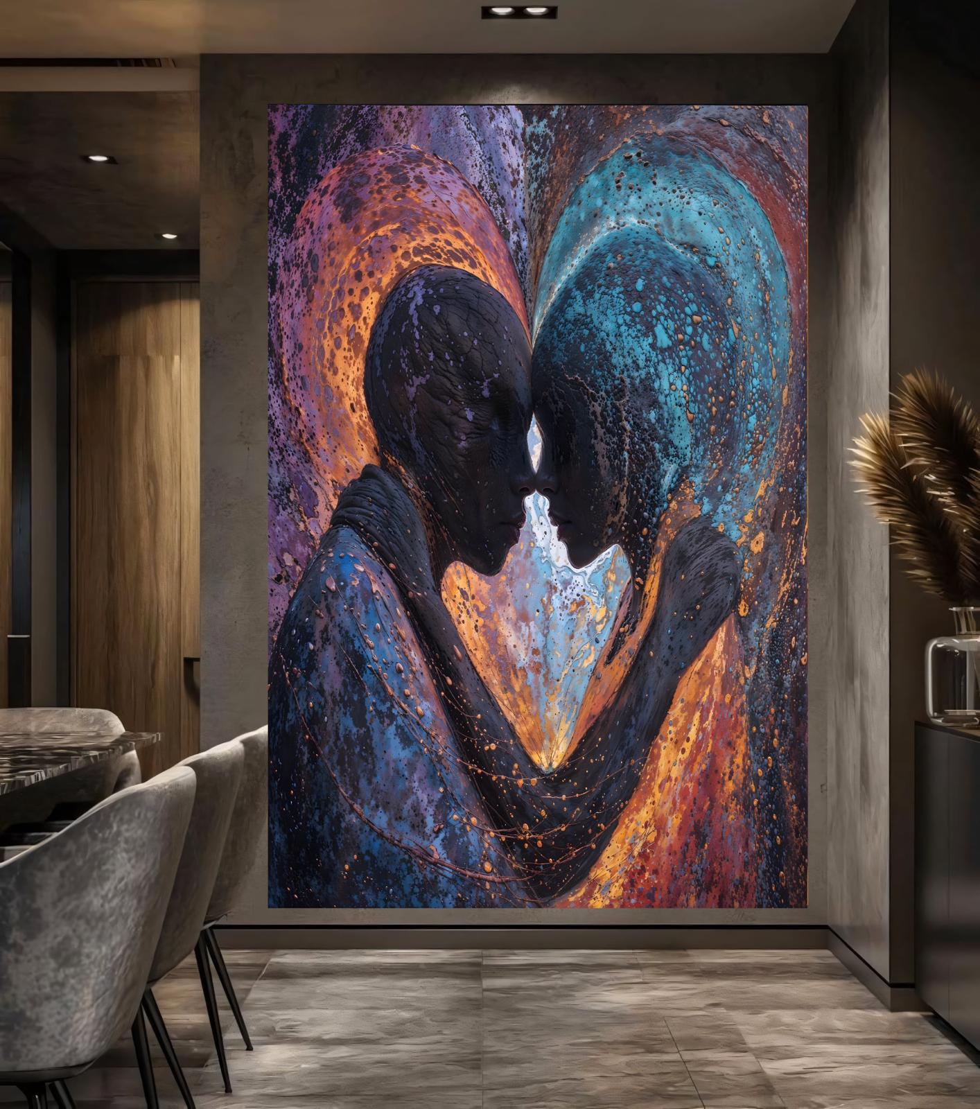 Transform your walls into a sanctuary of soulful connection. This "Cosmic Connection" canvas is a breathtaking visual journey, featuring two figures in a tender embrace that forms a radiant, celestial heart.