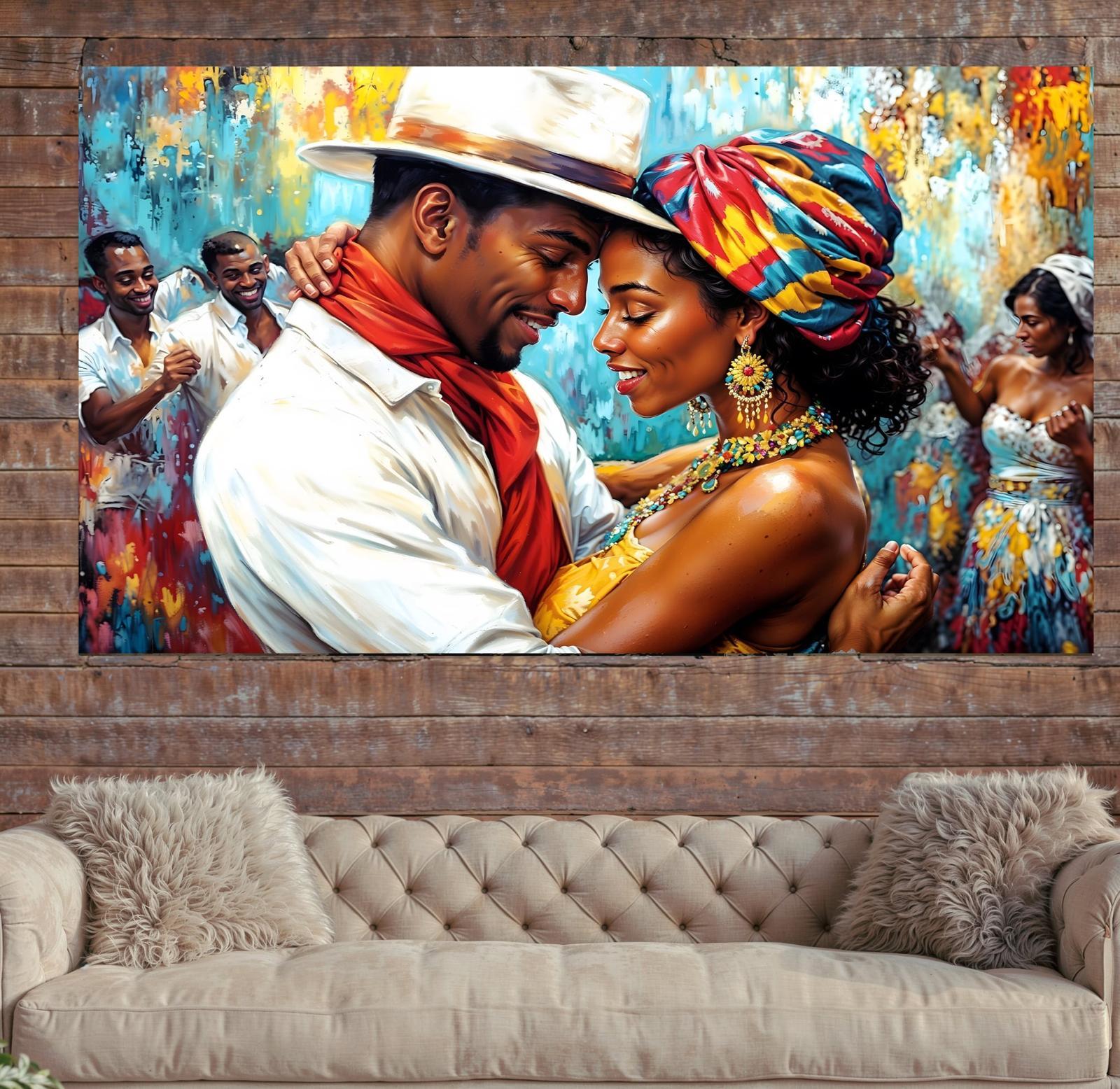 Experience the pulse of celebration and the warmth of connection. This "Tableau Noir Couple" canvas is a masterclass in emotional storytelling, capturing an intimate dance between two souls amidst a whirlwind of vibrant, expressive color.