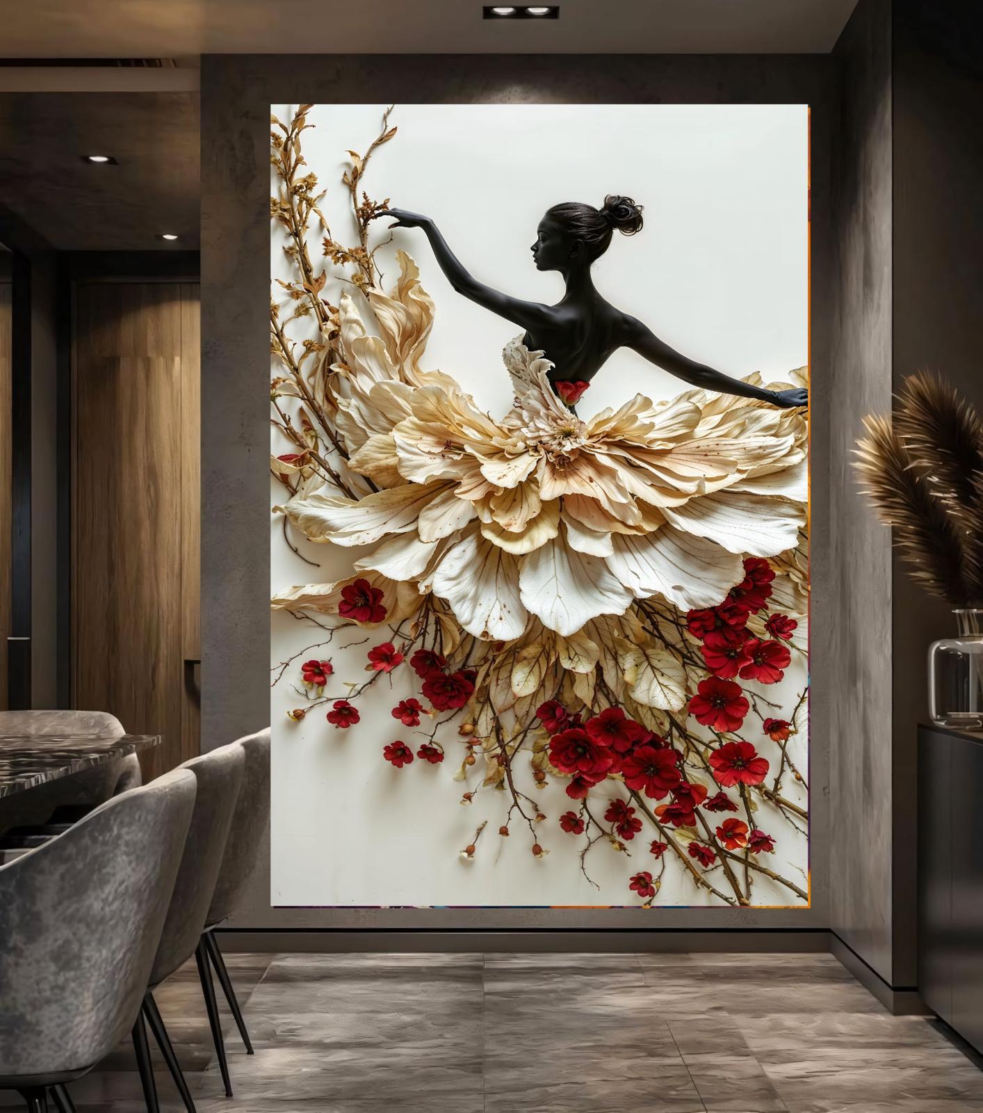 Transform your walls into a stage of natural elegance. This exquisite 3D Textured Wall Art features a graceful ballerina whose form is brought to life through a breathtaking fusion of silhouette and sculpture. Her striking dark form is balanced by a voluminous tutu of hand-sculpted, cream-colored petals, dramatically finished with a cascade of vibrant red blossoms.