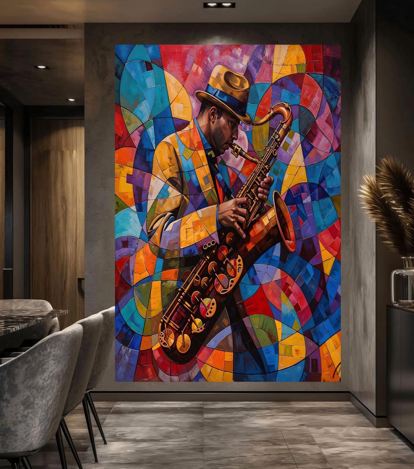 Bring the soulful energy of a midnight jazz club into your space with this captivating abstract masterpiece. This artwork doesn’t just show a musician; it captures the very movement of sound through a striking "fractured" geometric style.