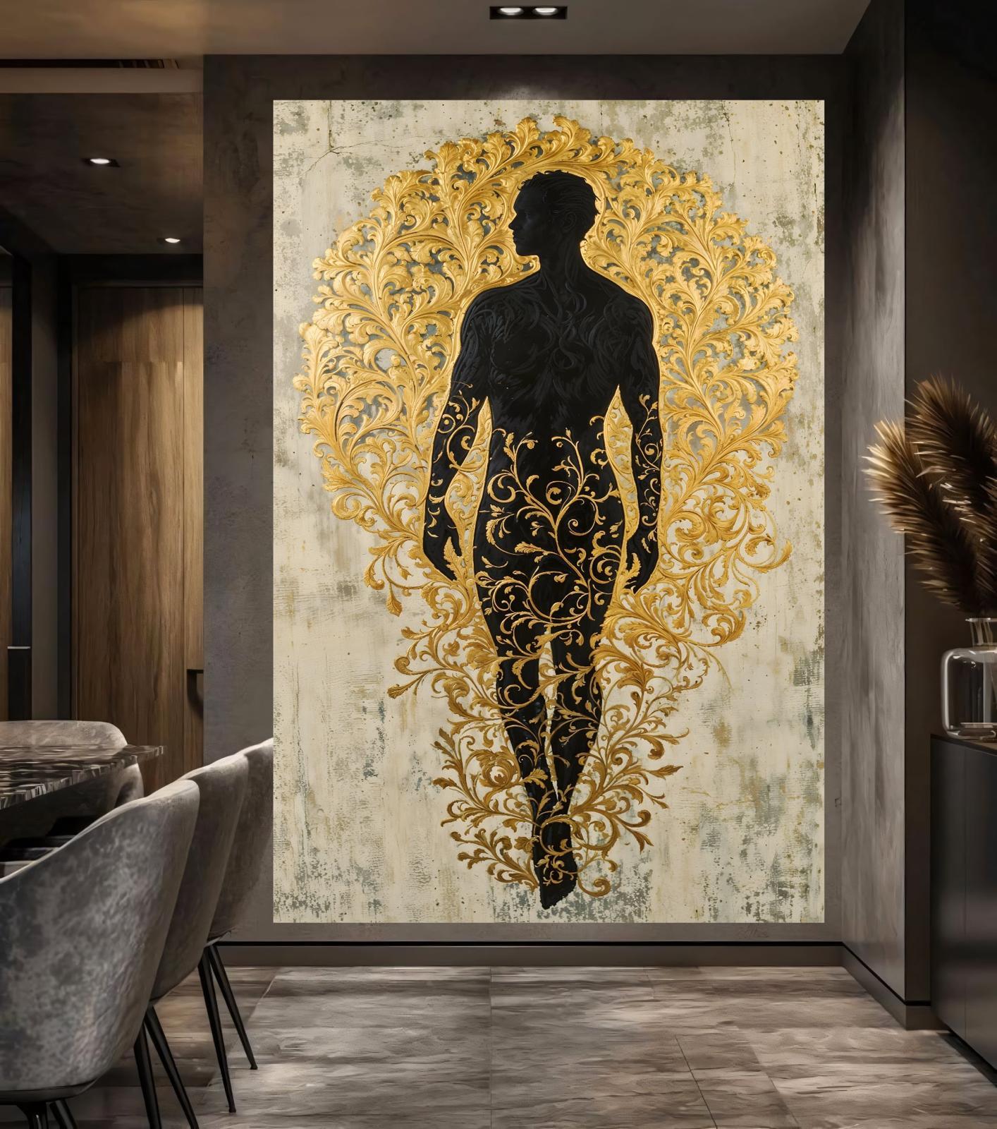 Elevate your home decor with this striking and luxurious canvas painting. This modern abstract artwork features a bold black silhouette of a walking male figure, intricately detailed with a delicate floral pattern that is echoed in the large, radiant gold motif surrounding him. Available as a high-quality print, perfect for adding a sense of style and artistic atmosphere to any space