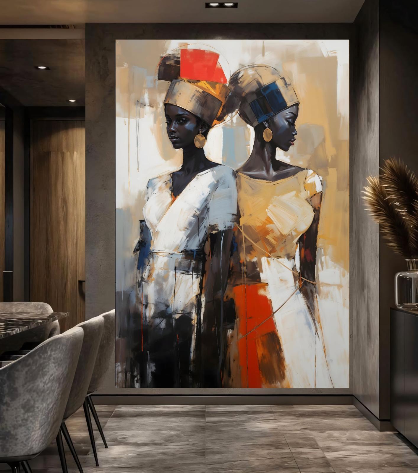 This striking abstract portrait celebrates the strength and beauty of Black womanhood through the symbolic power of the traditional head wrap an "African crown" that signifies dignity and cultural pride.This artwork is designed to do more than decorate; it is a statement of cultural richness. Its "painterly effect" adds a sophisticated texture that brings a sense of warmth and contemporary charm to any interior, serving as a constant reminder of grace and ancestral strength