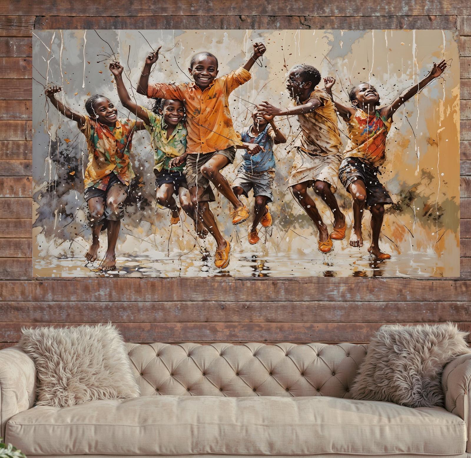 Transform your living space with this vibrant and energetic canvas painting, often titledAfrican Children Playing in Rain. This contemporary piece captures a spirited moment of pure joy, featuring a group of children dancing and jumping through falling rain against a textured, earthy background. The artwork's dynamic brushstrokes and drip paint style create a sense of movement and life, making it a popular choice for modern home decor