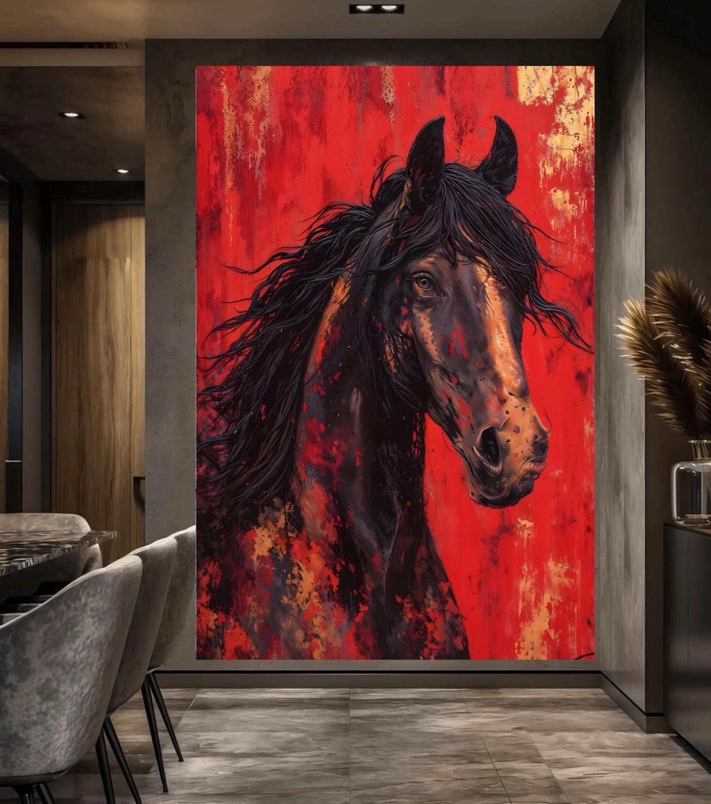 Capture the essence of untamed power with 'Ember Spirit.' This striking piece uses a bold, impressionistic style to showcase the majestic silhouette of a black stallion emerging from a background of fiery reds and shimmering gold. The long, flowing mane and vertical streaks of light create a sense of relentless momentum and inner fire. Perfect for a modern office or living room, this artwork serves as a daily reminder of resilience, passion, and the beauty of a quiet, focused strength.