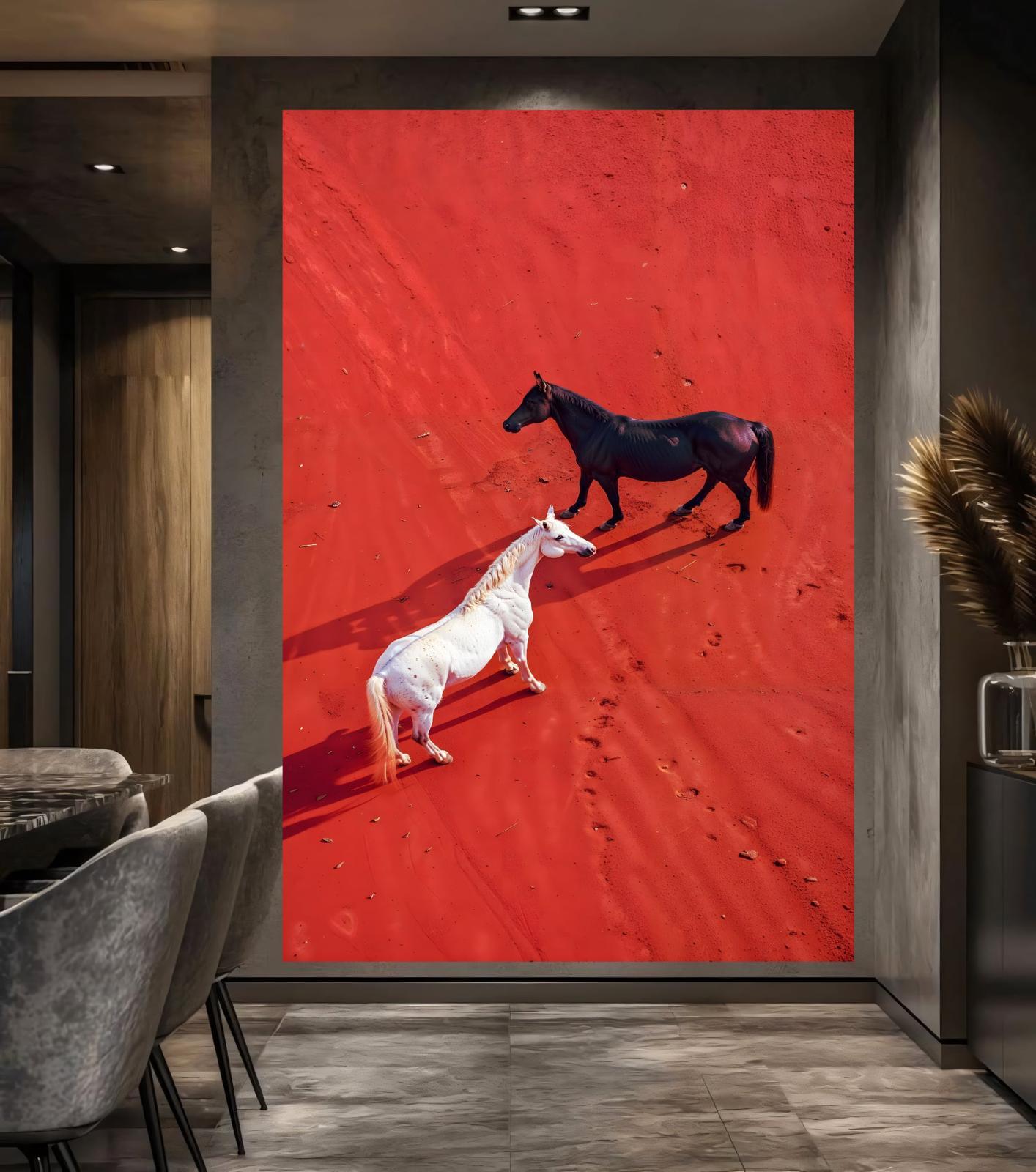 Command attention with a masterpiece of raw energy and timeless balance. This striking "Momentum & Grace" canvas features a magnificent black and white horse pair traversing a sea of vibrant, textured crimson.