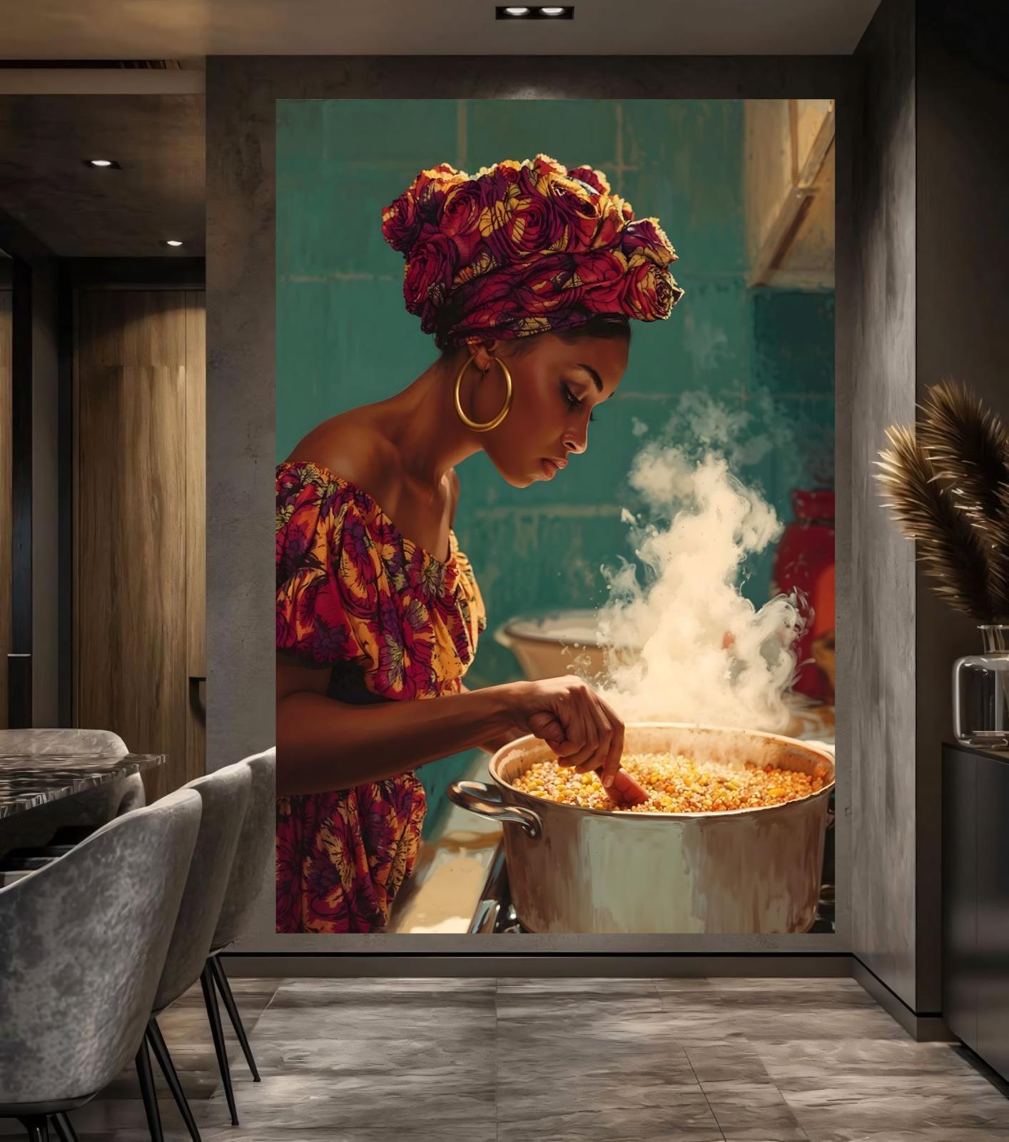 Celebrate the heart of West African culture with this vibrant piece of Afrocentric Wall Art. This soul-stirring composition depicts a woman in traditional attire complete with a beautifully patterned headscarf and off-the-shoulder dress expertly stirring a steaming pot of Jollof Rice. Ideal for kitchens, dining rooms, or cultural spaces where food and family take center stage.