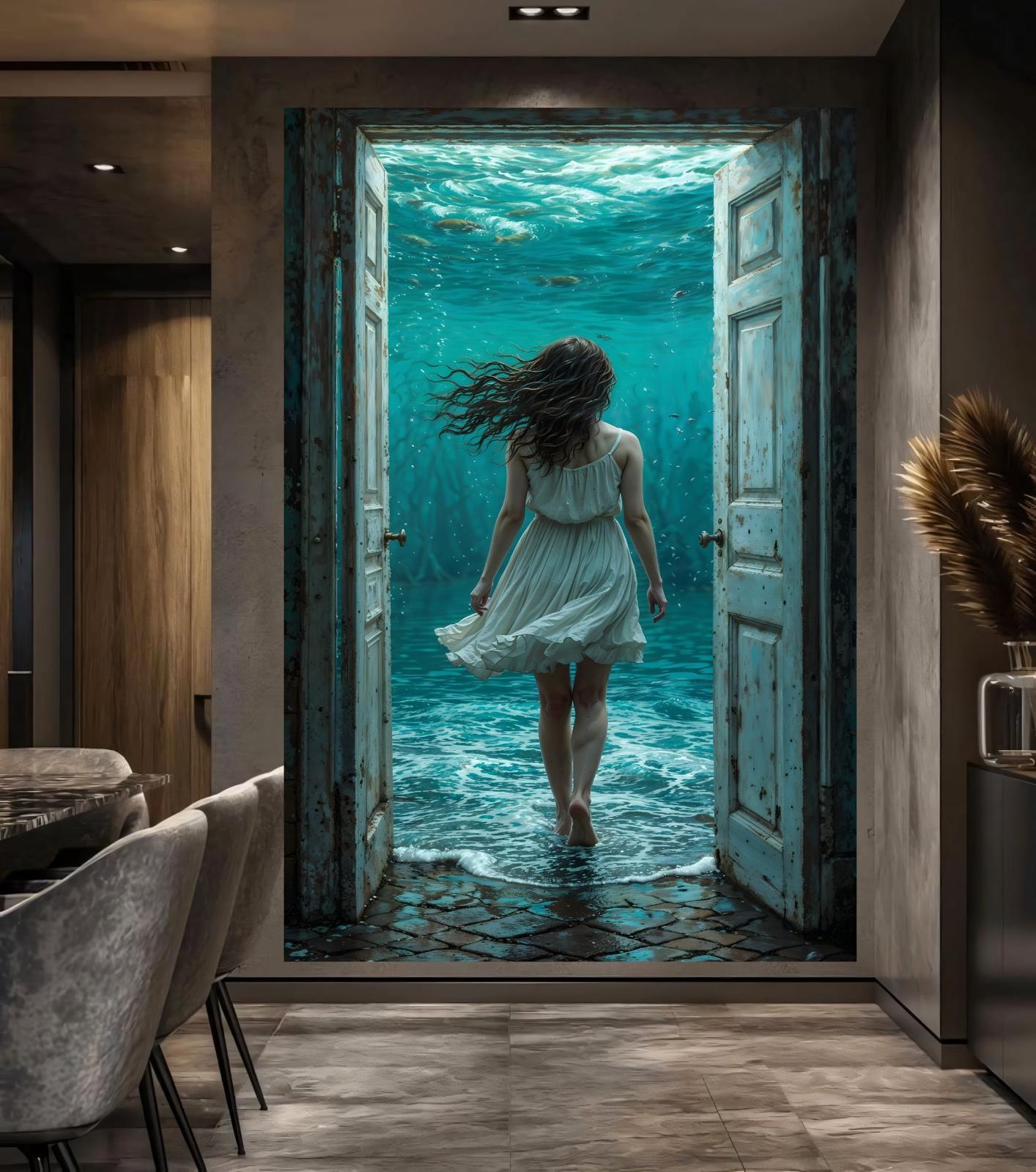 Transform your space into a surreal escape with the Ocean Portal Wall Art Canvas. This captivating piece features a dreamlike scene of a woman stepping through rustic doors into a serene underwater world, creating a stunning illusion of depth and movement. The blend of soft flowing fabric, turquoise ocean tones, and immersive perspective makes it a true statement piece for modern interiors.
