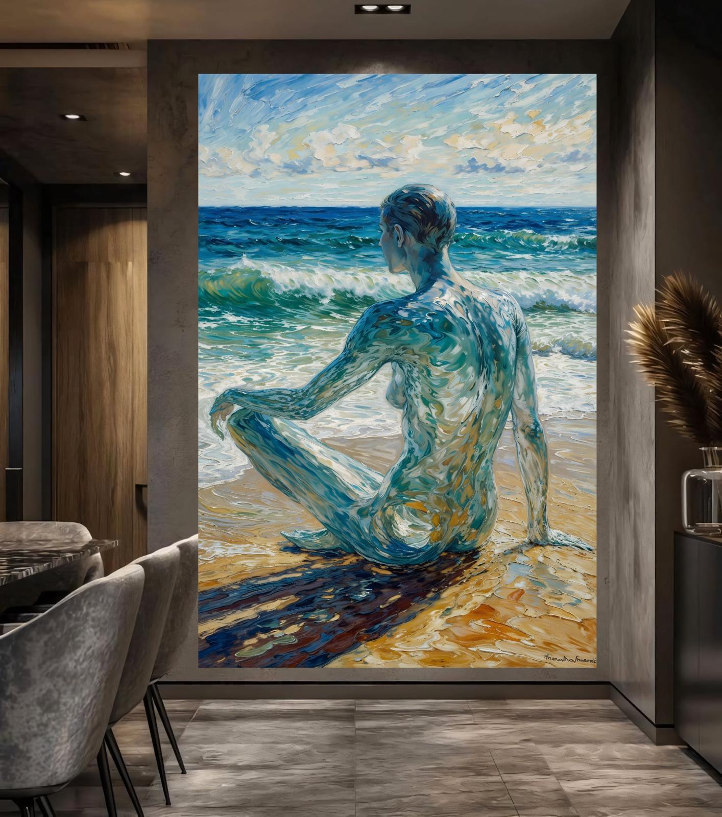 Bring a sense of calm and sophistication into your space with Ocean Serenity, a striking contemporary artwork that captures a reflective moment by the sea. This piece features a human figure seated at the shoreline, blending seamlessly with the motion of the waves through fluid, expressive brushstrokes. The fusion of ocean blues, sandy golds, and soft sky tones creates a harmonious visual experience that evokes peace, introspection, and connection with nature.