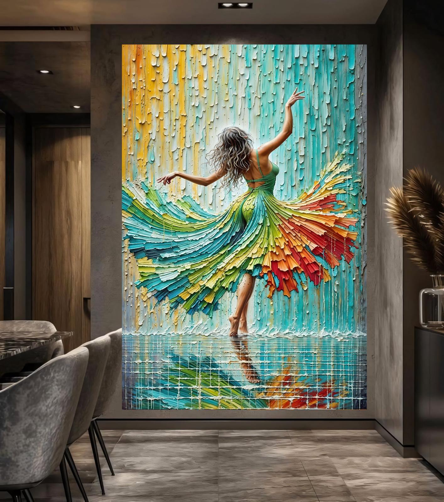 Infuse your space with a burst of pure, infectious energy. This "Radiant Rhythm" masterpiece is a breathtaking celebration of life, capturing a woman caught in a poetic, high-energy dance. Set against an explosive, sun-drenched backdrop, her form is brought to life through a rich, tactile mosaic of primary and earthy tones.