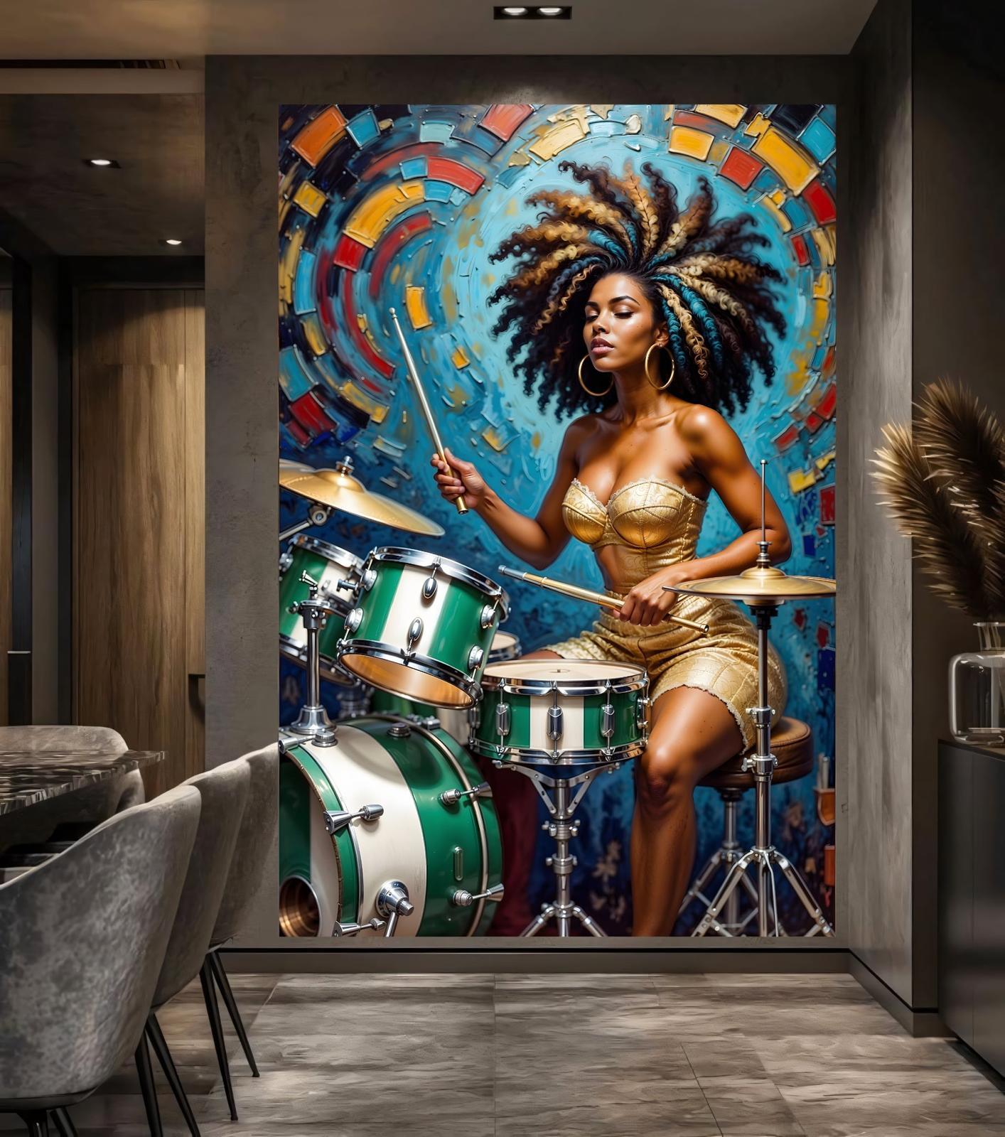 Command your space with the raw energy of the "Rhythmic Soul." This breathtaking large-scale mural is a masterclass in visual storytelling, featuring a regal drummer in a striking gold ensemble as she commands a vibrant green and white kit.