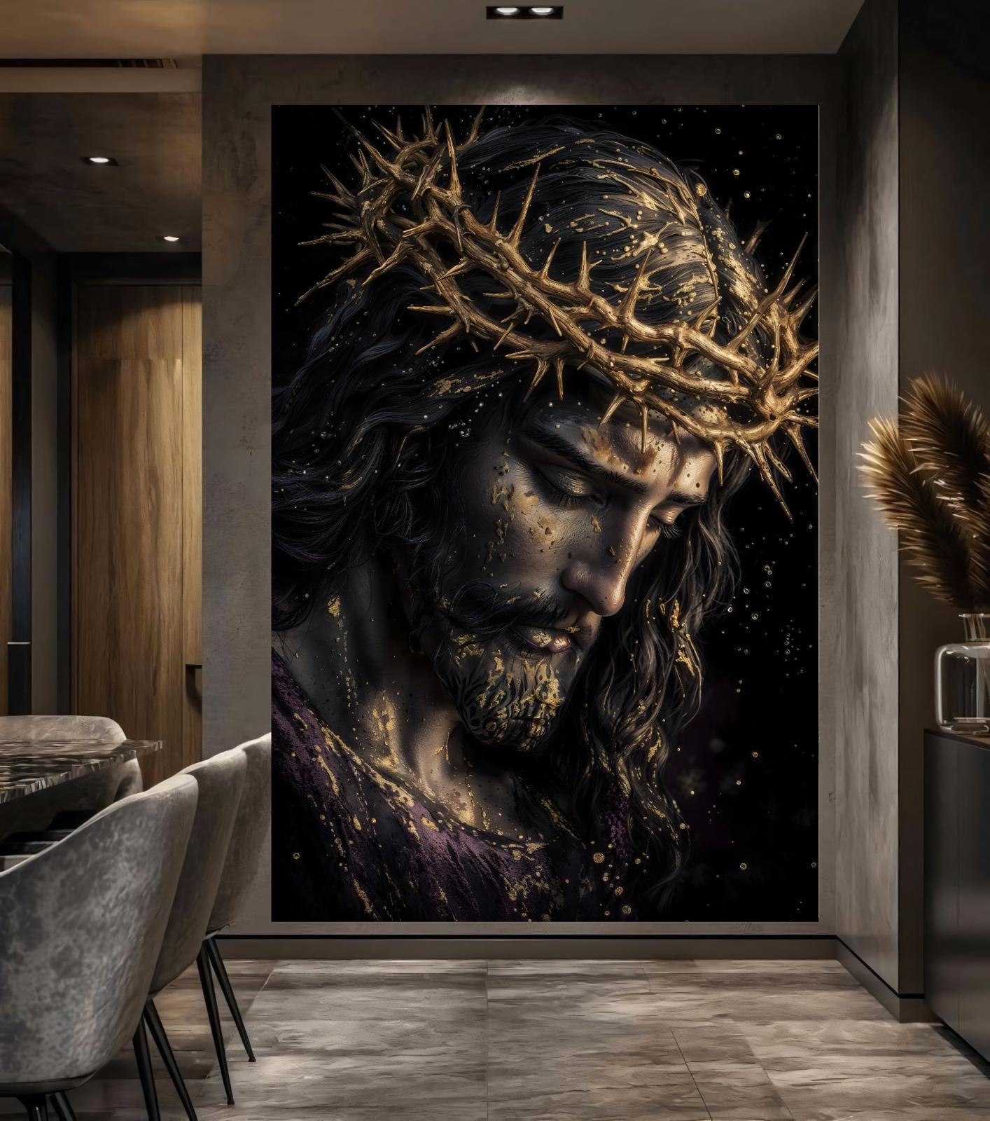 Invite a presence of profound peace and majestic beauty into your home. This Sovereign Sacrifice masterpiece is a breathtaking contemporary tribute to faith. Featuring a striking portrait of Jesus Christ, the artwork masterfully blends deep, soulful shadows with radiant, hand-touched gold highlights that bring the Crown of Thorns to life.