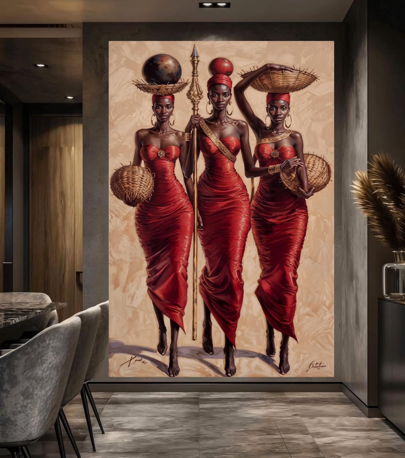 Command attention and inspire your soul with this magnificent piece of contemporary Afrocentric art. Sovereign Sisters is a masterclass in visual storytelling, featuring three regal African women in striking, floor-length red gowns.