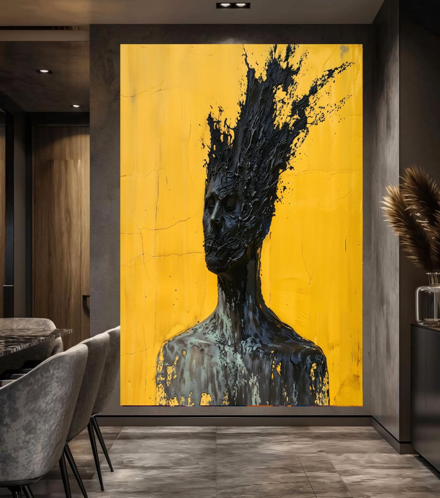 Command your space with a masterpiece of raw intellectual energy. This "Eruption of Thought" canvas is a breathtaking visual journey, featuring a striking obsidian-textured silhouette set against a brilliant, weathered yellow abyss.