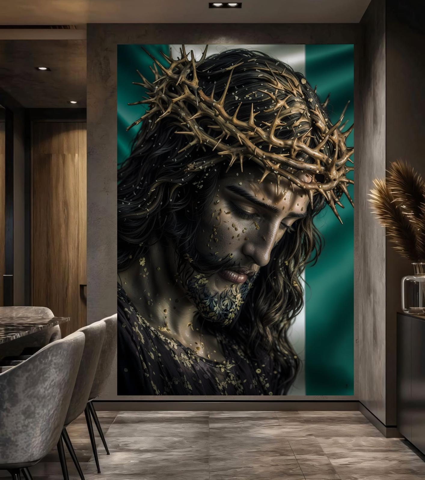 nvite a presence of profound peace and majestic beauty into your home. This "Golden Intercessor" masterpiece is a breathtaking contemporary tribute to faith and heritage. Featuring a striking portrait of Jesus Christ, the artwork masterfully blends deep, soulful shadows with radiant gold highlights that bring the Crown of Thorns to life against the iconic green and white of the Nigerian flag.