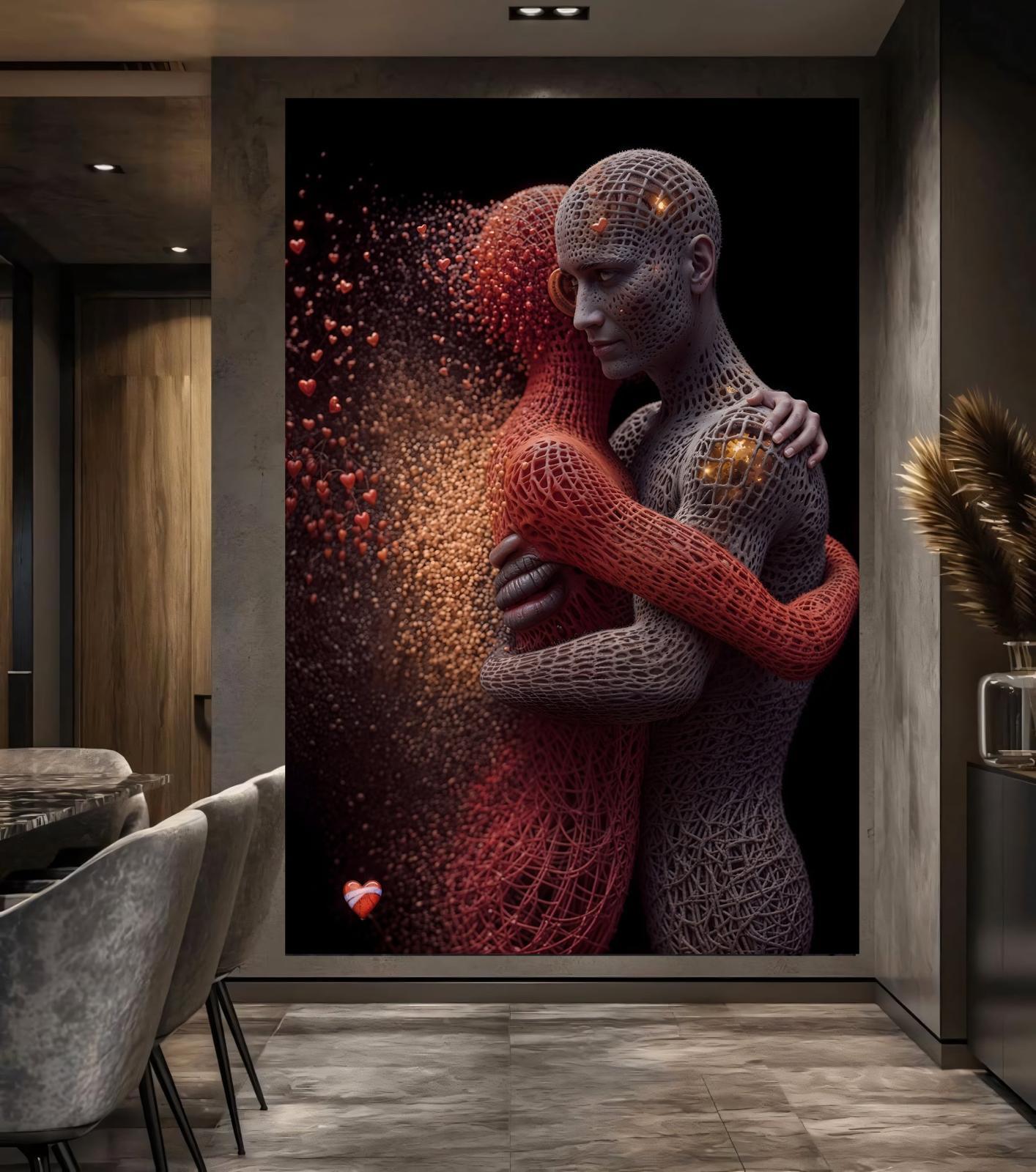 Step into the unseen world of human connection with 'Woven Souls.' This striking contemporary piece uses a unique digital mesh style to visualize the profound synchrony between two spirits. Rather than focusing on skin and bone, this artwork maps the delicate 'wires' of emotion and influence that bind us together. It is a powerful tribute to those rare connections that transcend form and distance, making it a deeply meaningful gift or a soulful addition to any modern, minimalist home."