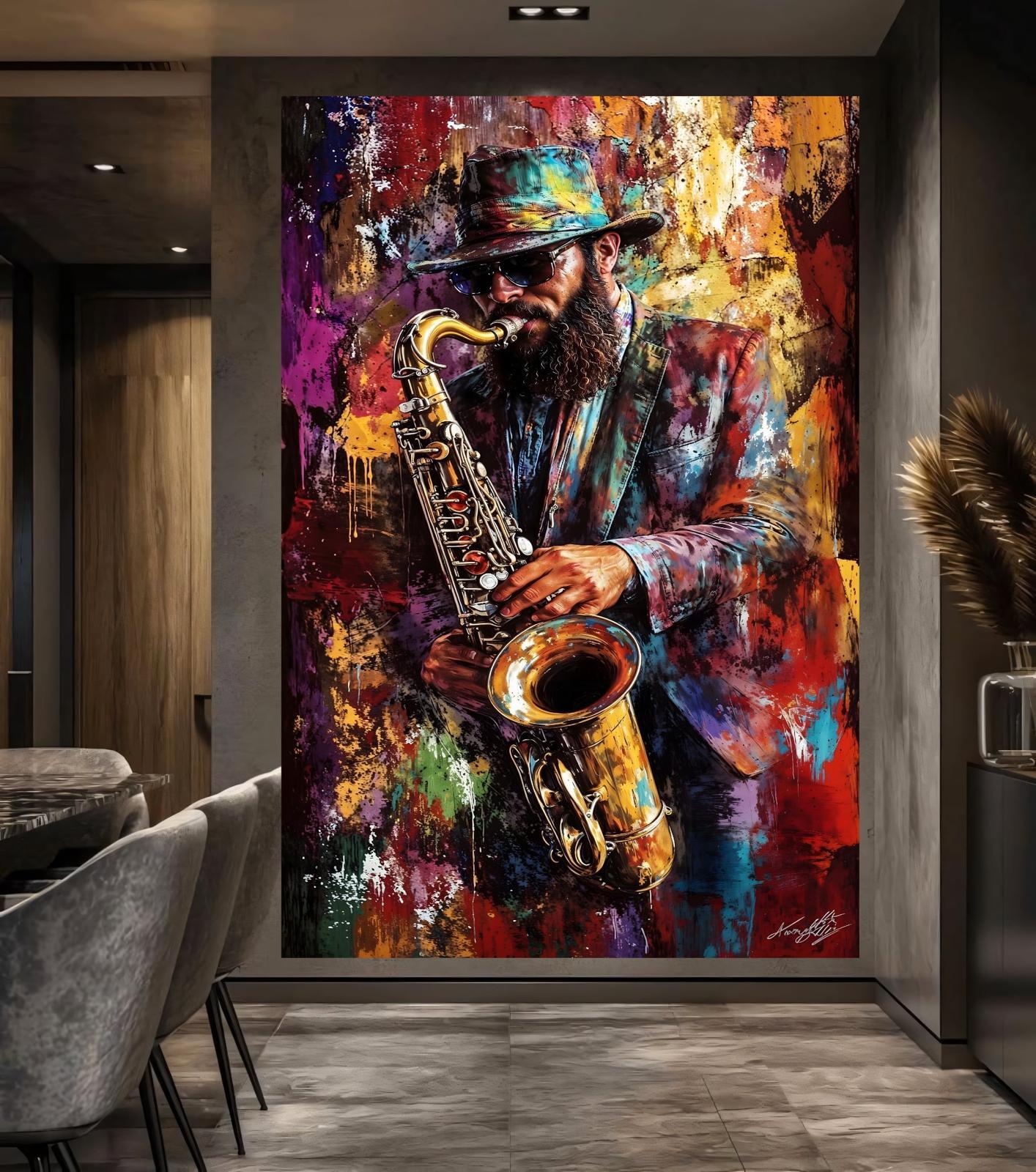 Give your walls a soul-stirring rhythm. This breathtaking "Soul of Jazz" canvas painting is a masterclass in visual energy, capturing the intense passion of a saxophonist in mid-performance. Set against an explosive, multicolored backdrop, the piece uses bold, tactile brushstrokes to make the music almost audible.
