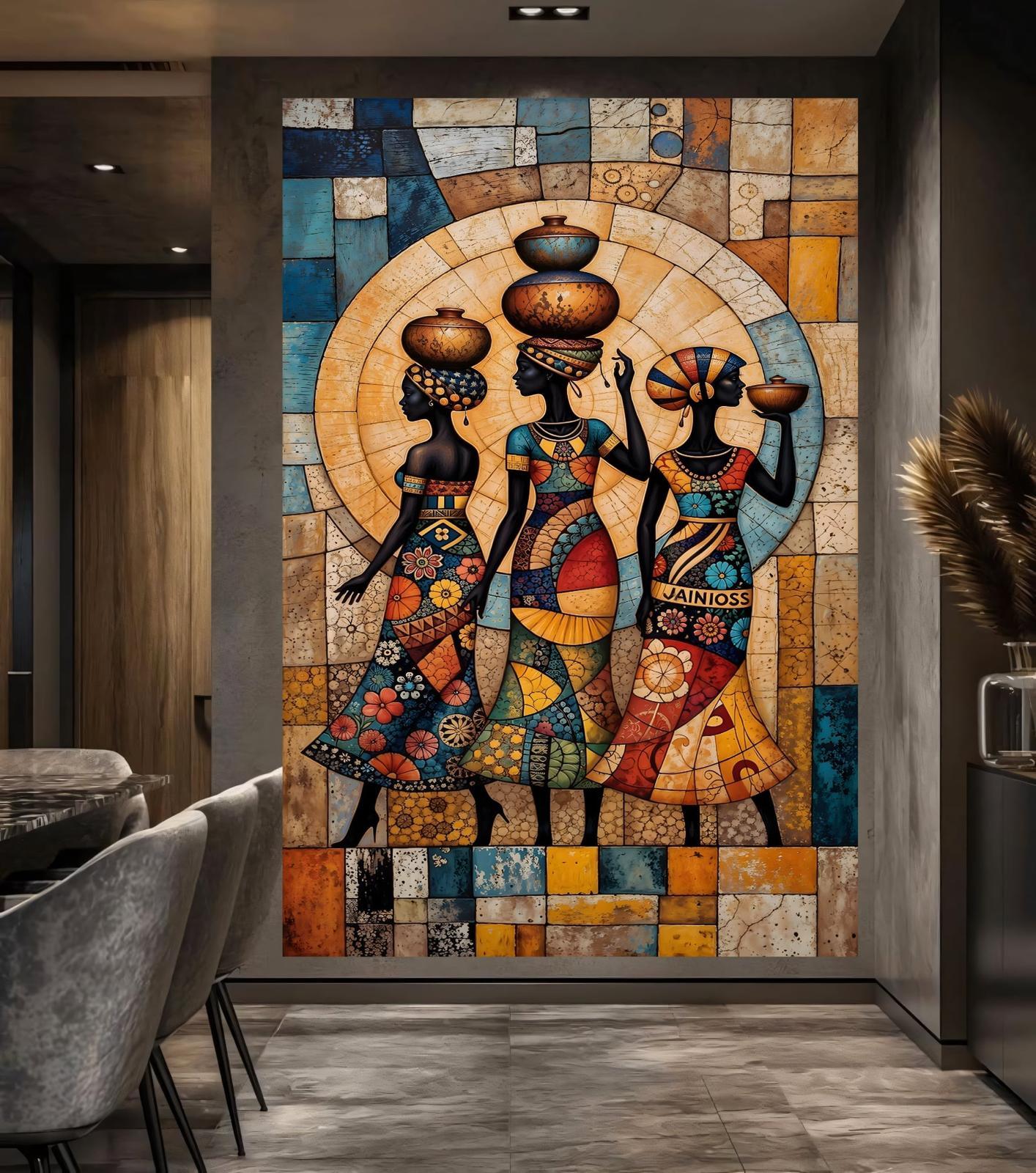 his striking contemporary piece celebrates the timeless strength of "The Water Bearers." Through a vibrant, stained-glass mosaic style, it honors the women who sustain life and community. The golden solar halo and rich, geometric patterns transform a scene of daily tradition into a regal statement of resilience and cultural pride