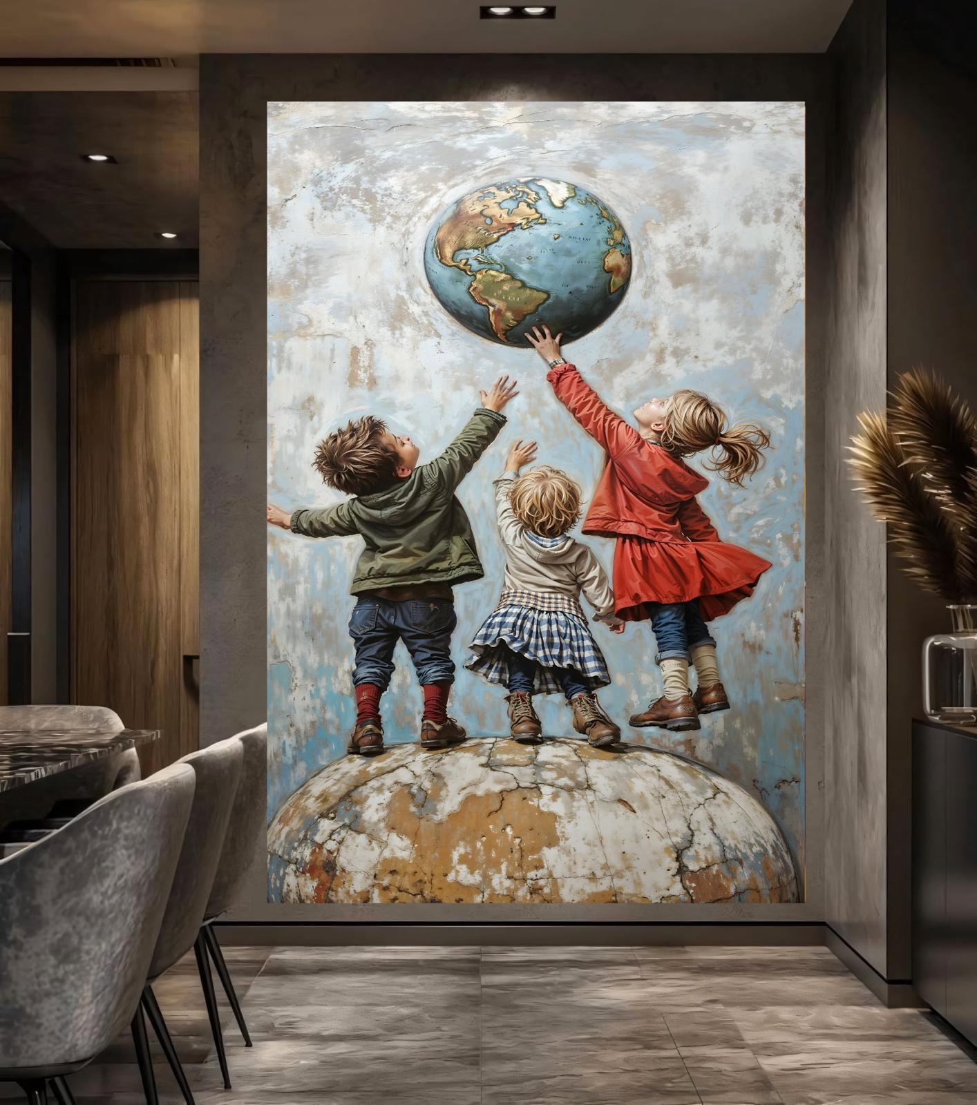 Inspire a world of wonder and a lifetime of stewardship. This breathtaking "World Seekers" canvas painting is a masterpiece of emotional storytelling. It captures the pure, collective ambition of childhood, showing three diverse children reaching for a vibrant, floating globe against a beautifully distressed, sky-blue backdrop.