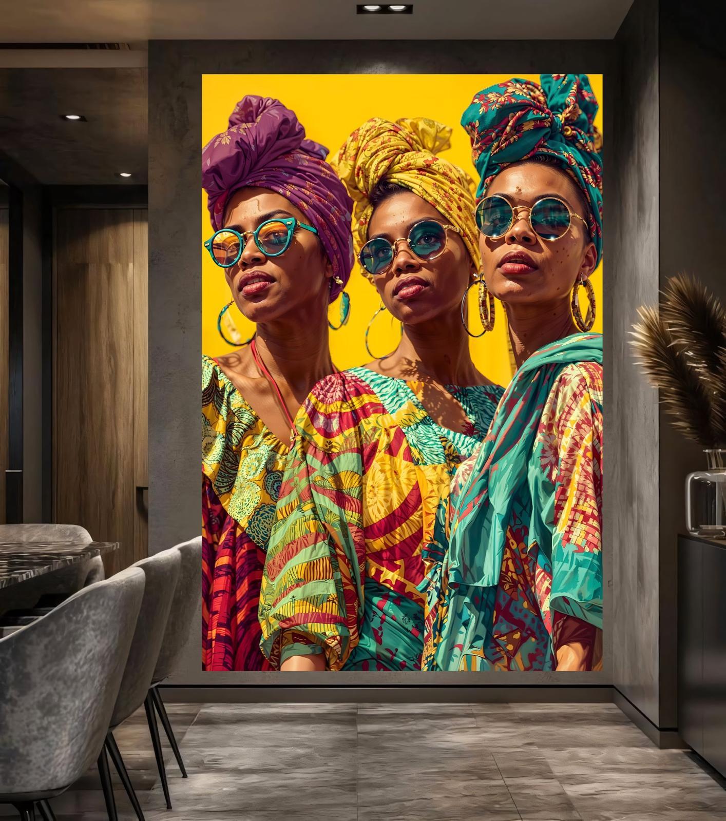Infuse your space with the radiant energy of a rising sun. This "Vibrant Sisterhood" canvas is a breathtaking celebration of African grace, featuring three women in magnificent, color-blocked headwraps and chic, contemporary sunglasses.